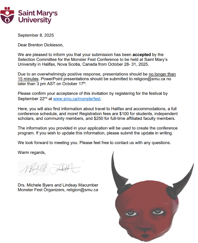 If you are local, check it out at https://www.smu.ca/monsterfest/. And here is my abstract, for anyone who may be interested, followed by my acceptance letter!