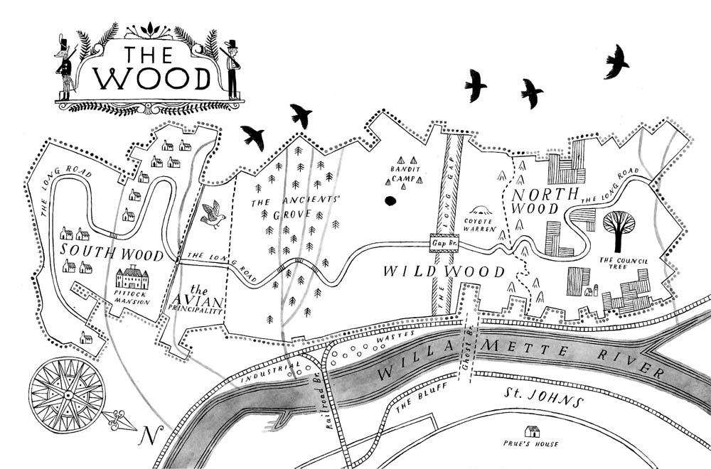 The Wildwood Chronicles—a sequel is complete and a third book is in the works—are born out of the husband and wife collaboration of singer-songwriter Colin Meloy and artist Carson Ellis. I have to say this is one of the most beautifully produced books for older children that I have encountered in some time—if I can use the idea of “production” to capture it. The writing is tight, descriptive, and imaginative—less poetic than Meloy’s songwriting for The Decemberists, but equally evocative. Meloy’s greatest strength is his sense of place. I have never been to Portland, and as I was not conceived within its trees I cannot visit The Wood itself. Yet I was thoroughly placed within the speculative geography of Prue’s adventure.