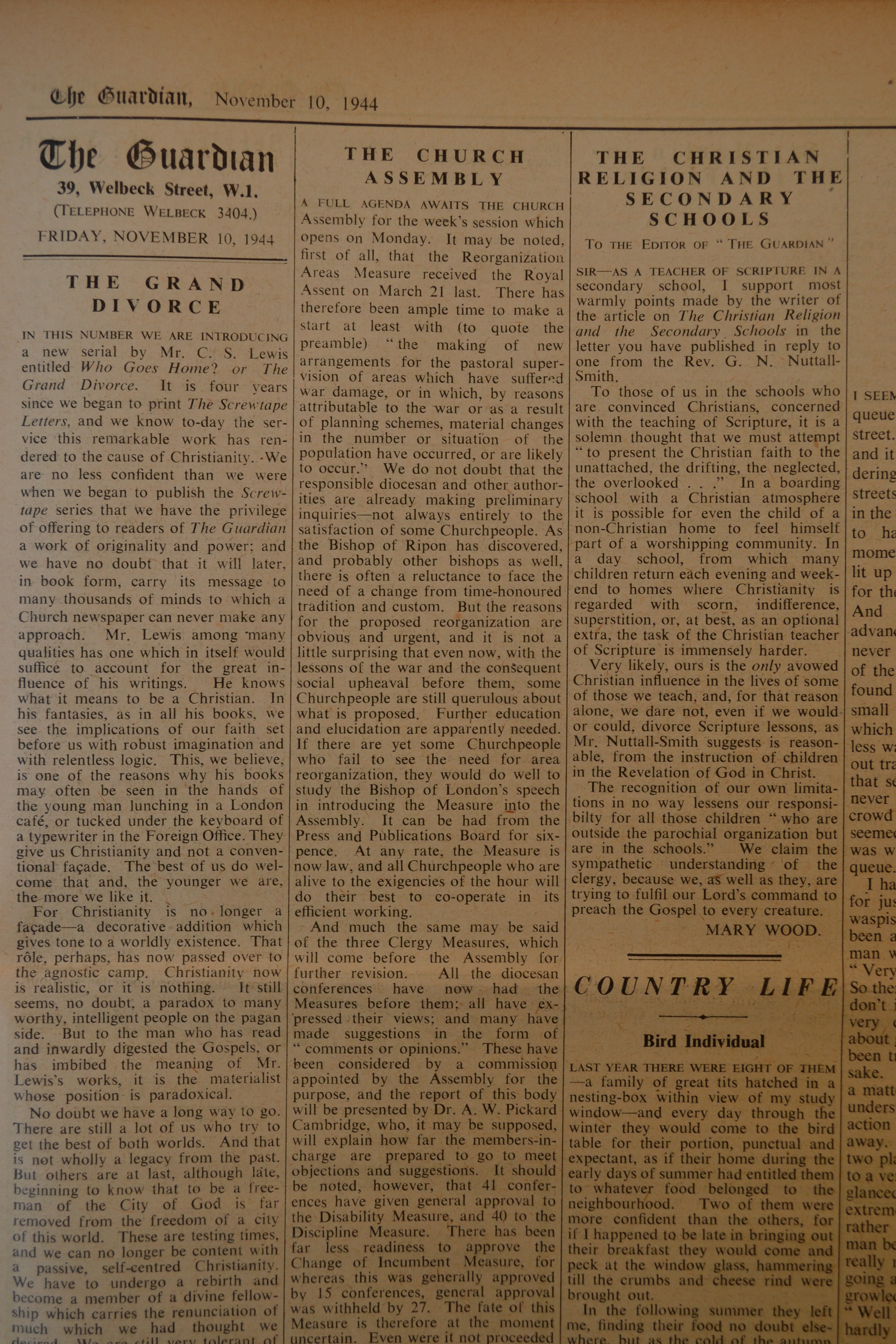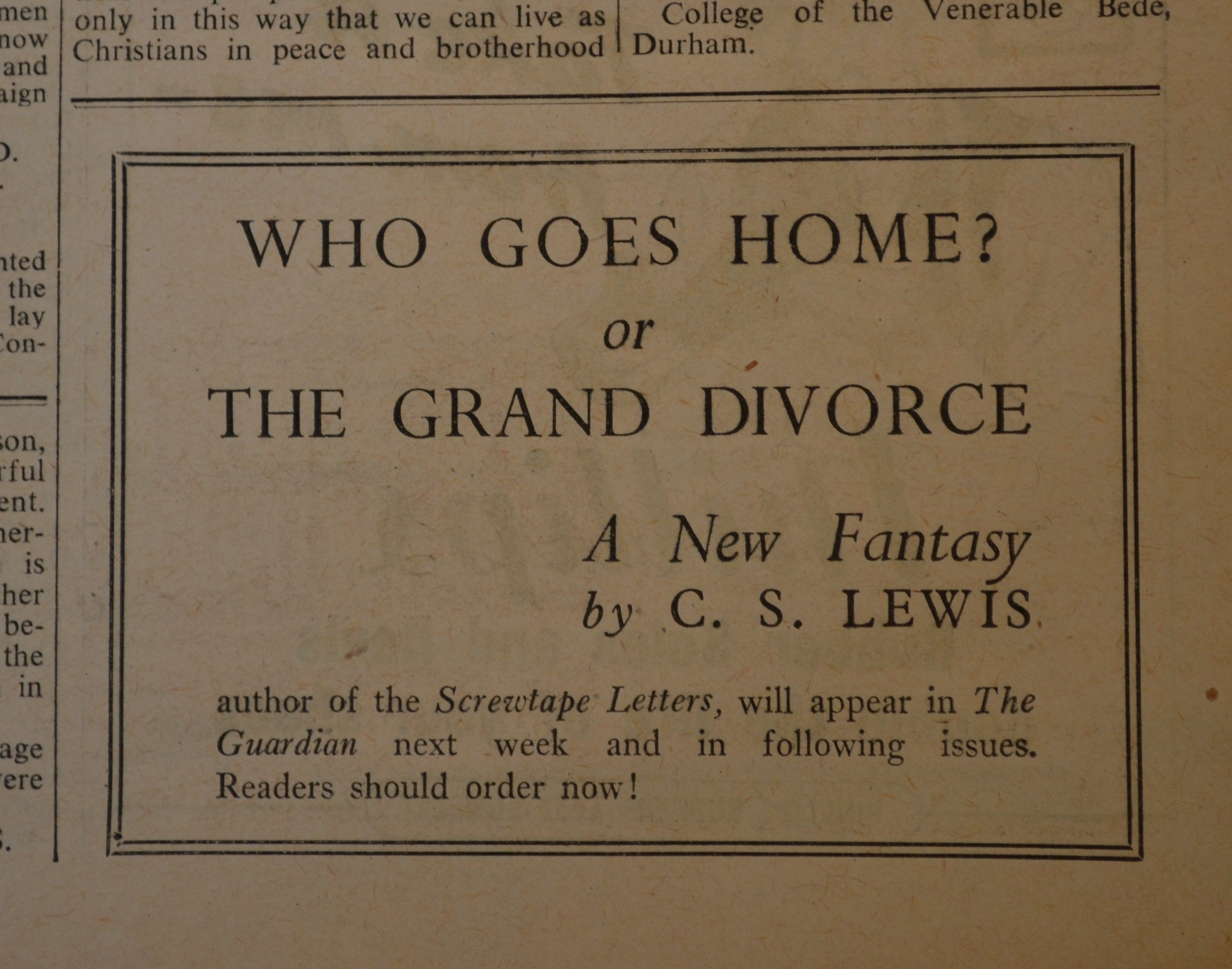 In this number we are introducing a new serial by Mr. C.S. Lewis entitled Who Goes Home? or The Grand Divorce. It is four years since we began to print The Screwtape Letters, and we know to-day the service this remarkable work has rendered to the cause of Christianity. We are no less confident than we were when we began to publish the Screwtape series that we have the privilege of offering to readers of The Guardian a work of originality and power; and we have no doubt that it will later, in book form, carry its message to many thousands of minds to which a Church newspaper can never make any approach. Mr. Lewis among many qualities has one which in itself would suffice to account for the great influence of his writings. He knows what it means to be a Christian. In his fantasies, as in all his books, we see the implications of our faith set before us with robust imagination and relentless logic. This, we believe, is one of the reasons why his books may often be seen in the hands of the young man lunching in a London café, or tucked under the keyboard of a typewriter in the Foreign Office. They give us Christianity and not a conventional façade. The best of us do welcome that and, the younger we are, the more we like it.