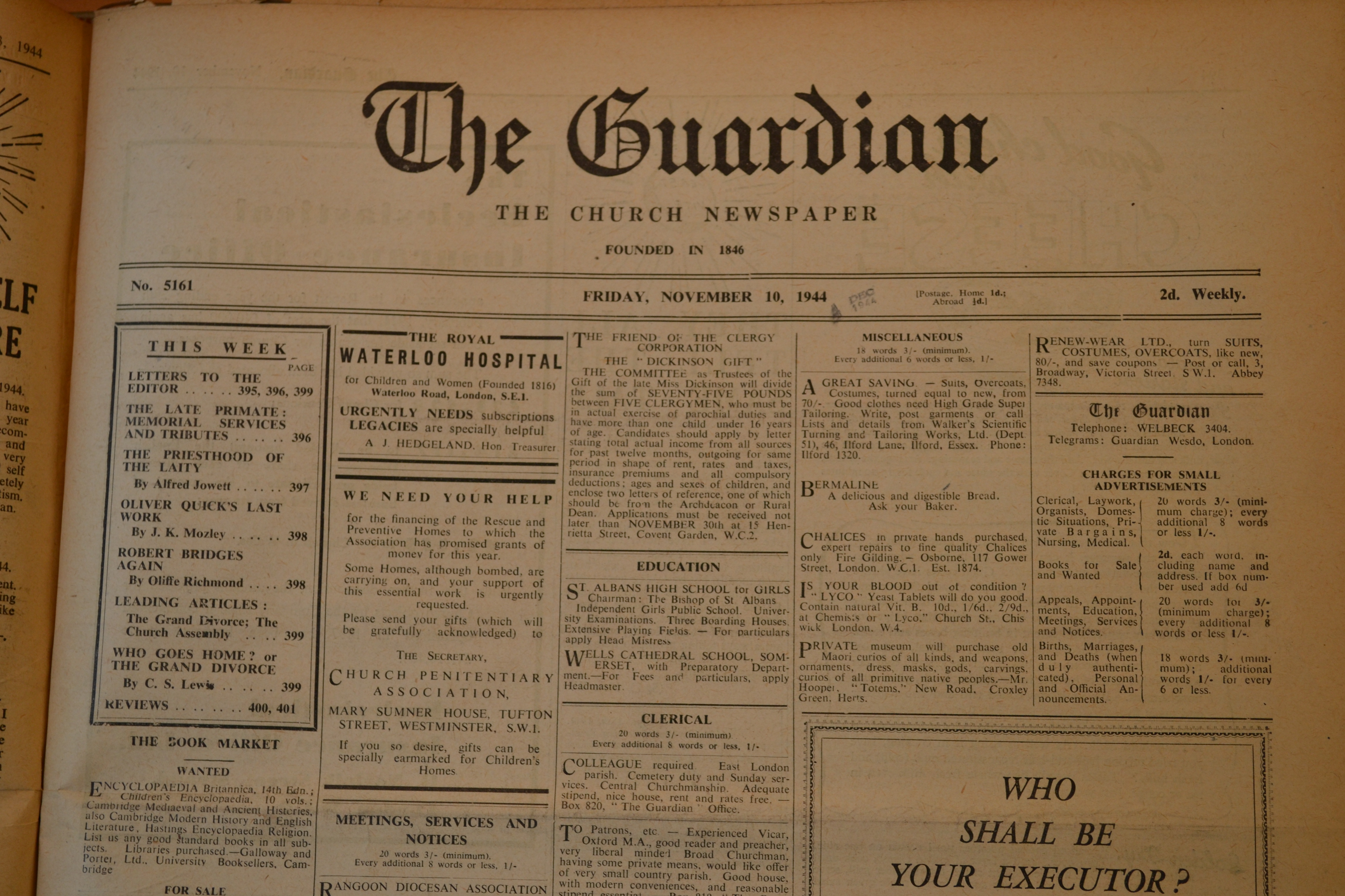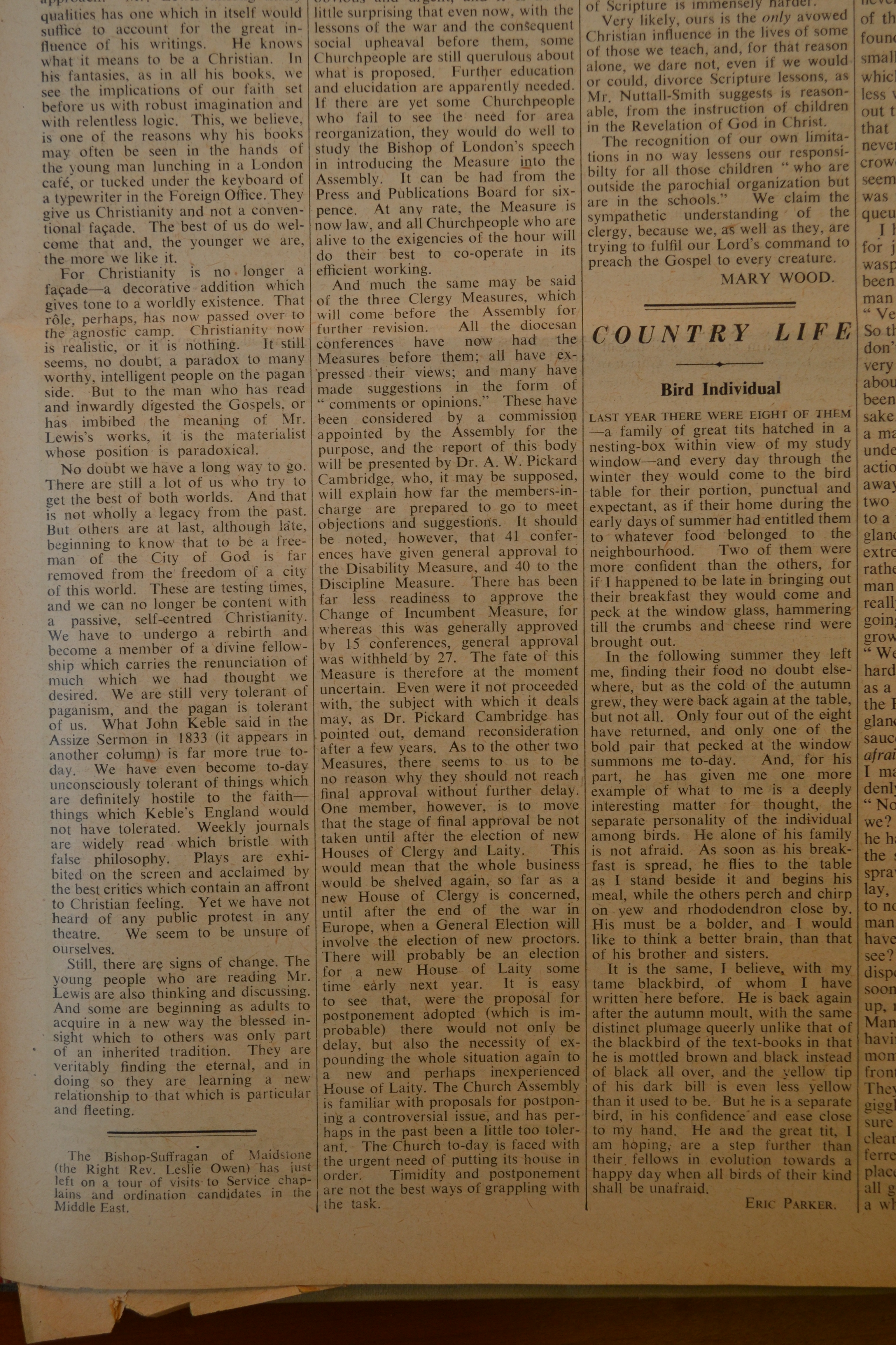 In this very textual weekly newspaper, the Letters to the Editor section was one of the more exciting features. It’s where educated readers were battling out important ideas in the Church of England at the time, like women in ministry, service to war orphans, international communication, the church in an emerging global market, and the relative merits of organ music. It’s no surprise, then, that the very popular C.S. Lewis–BBC commentator and Christian bestseller–was advertised in such a prominent place.