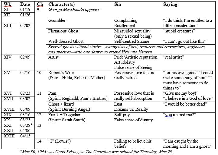 I am indebted to David Clark for the idea of creating a chart. Dr. Clark is a biblical scholar by training. With meticulous determination, Clark uses a series of appendices to C.S. Lewis Goes to Heaven to draw out a host of biblical, classical, and literary allusions in The Great Divorce. One of these charts includes a list of characters, their “sin” that makes adapting to the High Countries a challenge, and how much space is given to their story.