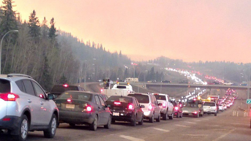 Smoke fills the air as cars line up on a road in Fort McMurray, Alberta on Tuesday May 3, 2016 in this image provide by radio station CAOS91.1. At least half of the city of Fort McMurray in northern Alberta was under an evacuation notice Tuesday as a wildfire whipped by winds engulfed homes and sent ash raining down on residents. (CP)