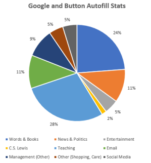Based on the Google Autofill list I created (see below, alphabetical), about 1/4 of my single-letter searches are about managing my world, including email. Teaching links and links to words and books (libraries, bookstores, and Goodreads) are tied with my news-hunting links at 18% each. Entertainment–just Netflix and Youtube–is a low category, as is non-books shopping. And C.S. Lewis is only a single occurrence, Joel Heck’s helpful resource site. A two-finger type would get me to lewisiana.nl, but all other Lewis and Inklings sites–and all my academic connections–are done through social media or the WordPress networking capabilities.