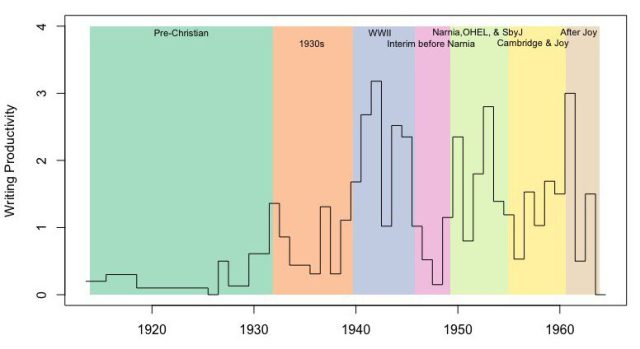 If we were only following a publication pattern, Lewis looks a little flat in the late 50s with a sudden spike after his wife died. What we see when we actually narrow in one when Lewis was working on things—as we do in my “Cheat Sheet”—we see a steady growth in completed work up until the fall after Joy died, and then a rest. Lewis became ill in parts of 1961 to 1963, but as Joe Hoffman’s chart recognizes, Lewis typically operated with a rest period after a high-output period. If we imagine that Lewis got well in 1963 instead of passing away, where would have turned?