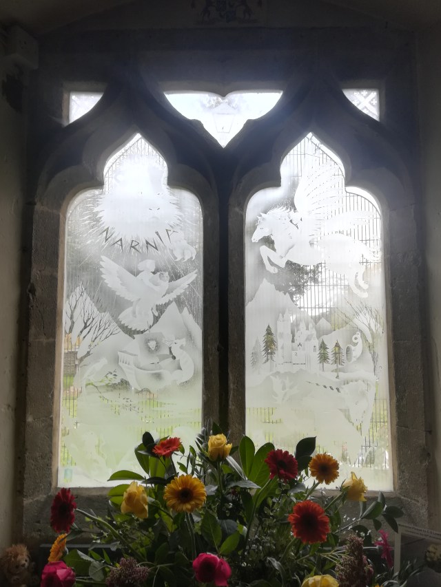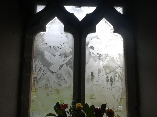 There is also, of course, the quietly famous Narnia window. It is such a soft light, and such a nice touch, that I’m pleased that it will never interrupt the church’s worship. Unfortunately, my pictures at late afternoon are terrible–though perhaps google can accentuate what I have left in outline here: