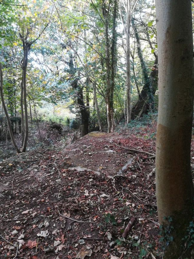 “And, I must admit, I’m more than curious and a little afraid to know what creature lives in this hole under this hill.” A good question! It looks like there’s some leeway for various sorts getting in and out – we sometimes saw foxes ranging around the close (could one squeeze in there, I wonder?), and bats hunting along the streetlights (might any think the ceiling there worth hanging from?). That was, so far as I recall, the bomb shelter – though I don’t recall how much occasion there was to use it, during the War (a homeward-bound German bomber did once dump some ‘superfluous’ bombs, I think further along the hill than that meadow at the top of the woods).