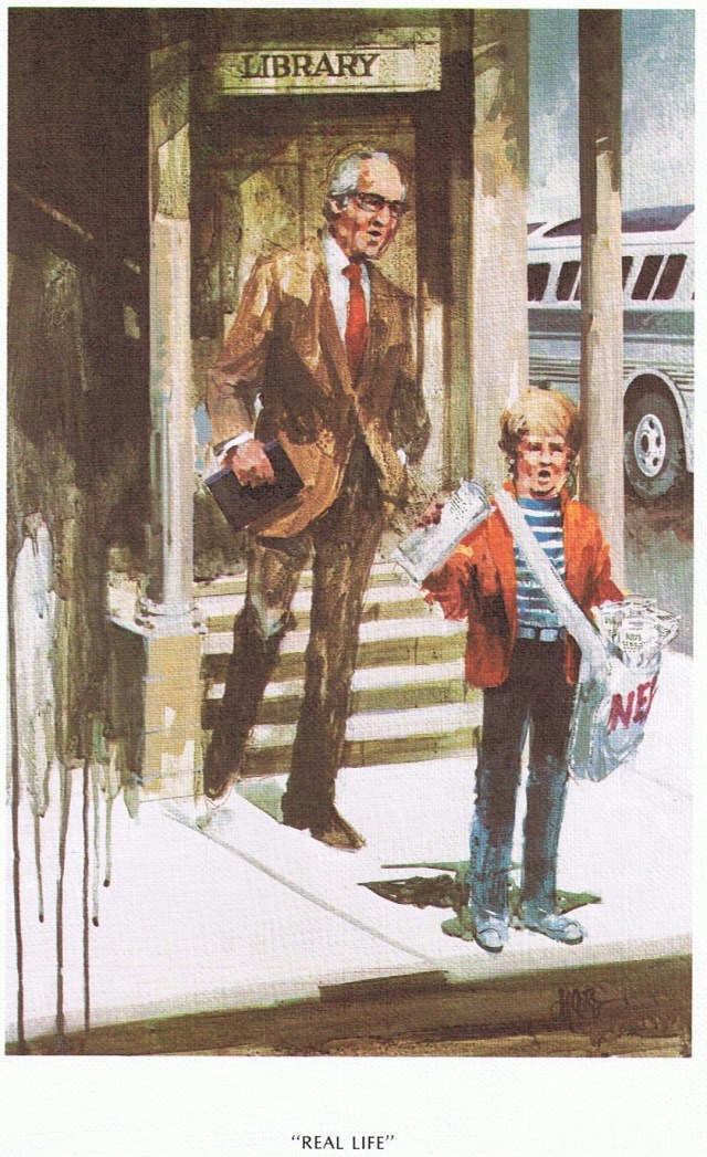 The paintings are all by Wayland Moore, a celebrated American artist, now most famous for his sports paintings released for a mass-market audience. His work would be best described as inspired by Screwtape Letters rather than a specific illustration of the book in order to enhance the narrative. The watercolour paintings appear sporadically, a surprise to the reader as we see the moments in Screwtape that grabbed Moore’s imagination. Most of these moments are contextual, a layering of the landscape behind the letters. So we see a boy selling a newspaper, the collage of the victim’s imagination, a cocktail party, an old man reading by the fire, a young man reading by an old mill.