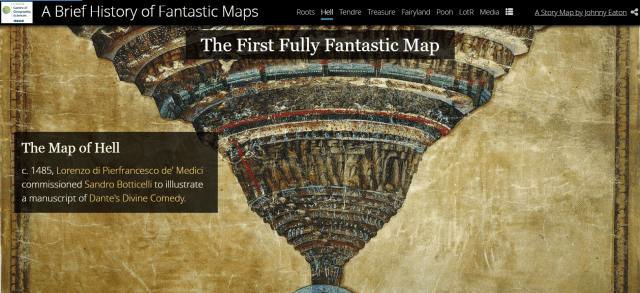 For today’s Friday Feature I wanted to share this gorgeous website, “A Brief History of Fantastic Maps, from Paleolithic Cave Drawings to the Futuristic Possibility of Immersive Geographies.” I have been curious about GIS utilities for reading fantasy literature, and Johnny Eaton has given us an admirable resource using the ArcGIS Story Maps tool by ESRI. There are interactive maps of some of the books we love, like the work that the Emil Johannson’s LOTR Project has done. Johnny Eaton’s work uses the LOTR Project, but puts in context with historical maps and then extends it out to other fictional universes, like Fairyland, Winnie-the-Pooh, and some contemporary film. You can find his interactive map here.