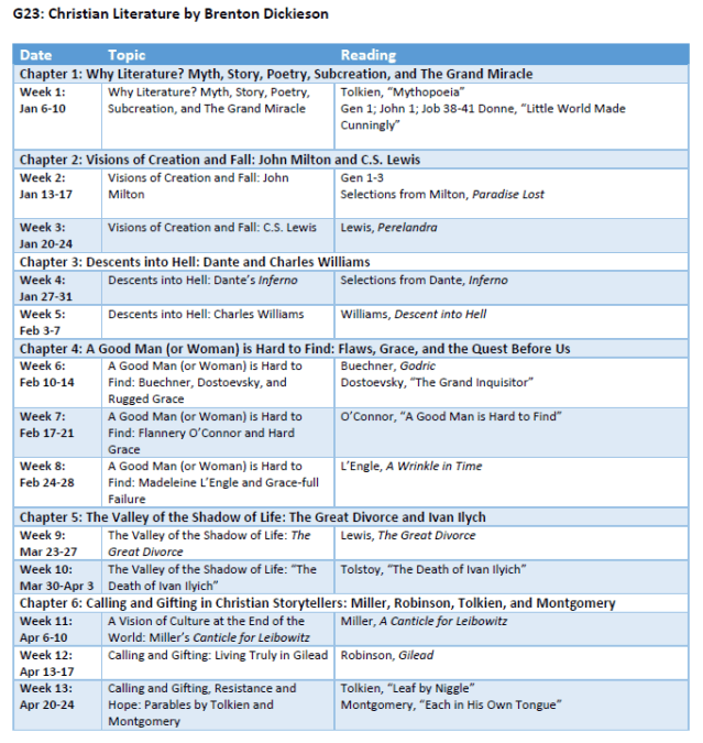 I thought I would also share my reading list for the course, in pictorial and chart form. I love the books were are reading, though I wish I could add 3 or 4 more. I regret dropping The Screwtape Letters and Shūsaku Endō’s Silence–two books I’m teaching in other courses this semester. Endō would really jolt me out of my cultural tendency. It’s not a monocultural list: there are 4 UK writers, 1 Canadian writer, 5 US writers, 1 Italian writer, and 2 Russian writers. Given the historical nature of the course, a ration of 9:4 men to women writers is good. But I’d love more diversity.