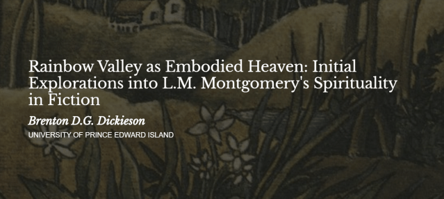 - Rainbow Valley as Embodied Heaven: Initial Explorations into L.M. Montgomery’s Spirituality in Fiction in the Journal of L.M. Montgomery Studies (full open access)