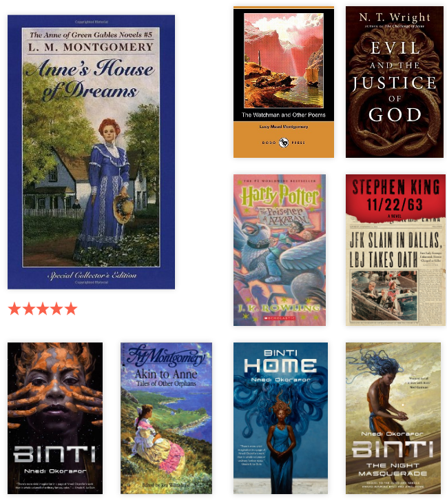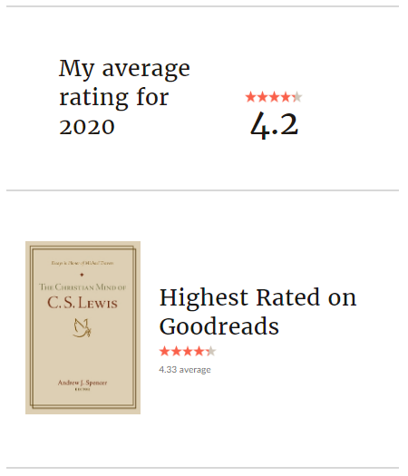 My average book rating is 4.2 stars–which is normal for me. I rate books too highly, I know. It comes from my years ranking music, where 5 stars goes to songs I want to hear most often, and so on. To be fair, I try not to read books that warrant 1, 2, or even 3 stars. My DNF pile is relatively high, but I also tend to read great authors–C.S. Lewis, J.R.R. Tolkien, J.K. Rowling, L.M. Montgomery, Frederick Buechner, Octavia Butler, Marilynne Robinson, Flannery O’Connor, Shūsaku Endō, Madeleine L’Engle, Anne Rice, Jane Austen, Charlotte Brontë, Haruki Murakami, and great discoveries this year like Alix Harrows and Nnedi Okorafor. Great authors that I love like Stephen King have some stinkers in their book basket, but generally when I am reading for interest or enjoyment, I stick with the best. Intriguingly, the highest rating on Goodreads book is one of my lowest rated of 2019 (a mixed collection with some good essays in it).