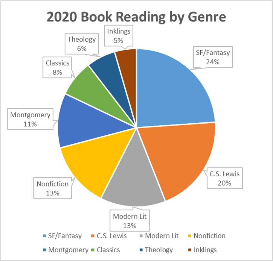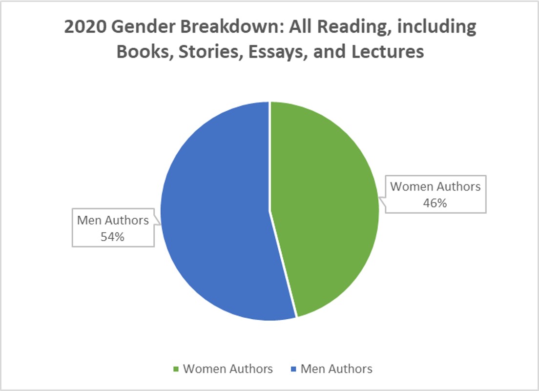 My final goal was to achieve a 1:2 ratio of women and men authors. This is tough to do when your primary author is male (C.S. Lewis), his primary partners are male (Tolkien and the Inklings), and my field has been largely male (theology). As I was extending more deeply into Montgomery studies, and reading through the catalogues of Octavia Butler, Marilynne Robinson–and added Harry Potter, Flannery O’Connor, and Anne Rice’s Vampire Chronicles as well–I was confident I would surpass that ratio this year, and come much closer to gender parity. In that way, it was my best year yet. For entire books and in my reading as a whole, it was 54% men to 46% women, and for all my reading. In 2021, I suspect that will be closer to 60/40.