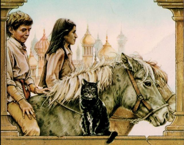 But unless I am mistaken there is no scene in the novel like the cover image with Shasta and Aravis riding Bree and Hwin, in Tashbaan, with a cat on a window sill.