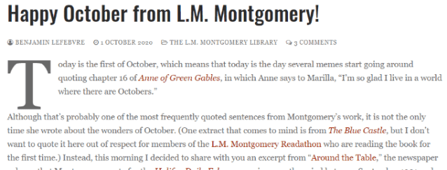 “I’m so glad I live in a world where there are Octobers,” Anne cries out, thrilled with her world. I am glad too, and wanted to wish you the best this month, dear reader.