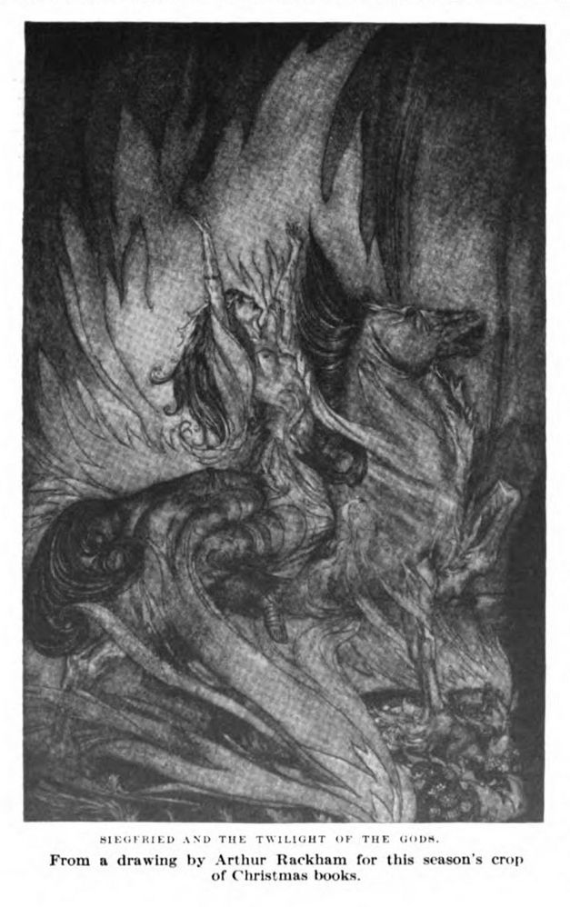 [1] Rackham’s illustrations of Siegfried and the Twilight of the Gods were published in late October 1911, together with Margaret Armour’s recent translation https://archive.org/details/siegfriedtwiligh00wagn/mode/2up. The first volume The Rhinegold and The Valkyrie was published in 1910.