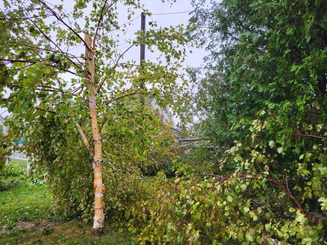 Beyond the water damage, we are thankful that we don’t have any structural problems with our house and barn. We are sad that of the 6 trees on our property, the storm took out 5 of them. About 1/3 of the branches from our young (about 45-year-old) Maple came down, and its sister next door was demolished. However, the Maple tree with Nicolas’ treehouse held firm. Two 15-year-old paper birches fell—though one of them is snapped at a high enough point that it may throw up its crazy white branches and keep going. Saddest of all, is the loss of our 17-year-old Cherry tree. The Cherry provides shade and colour and pollinates with a neighbour’s tree, a place for birds and bees and cats’ fascinations. Its leaves were just turning auburn and burgundy this week. It fell and crushed the dwarf apple tree (and part of the garden) beneath it. It is a loss. Admittedly, that apple tree is the ugliest thing in nature besides mole rats, with tasty wormy apples from branches glued back together after previous storms. It may survive yet.