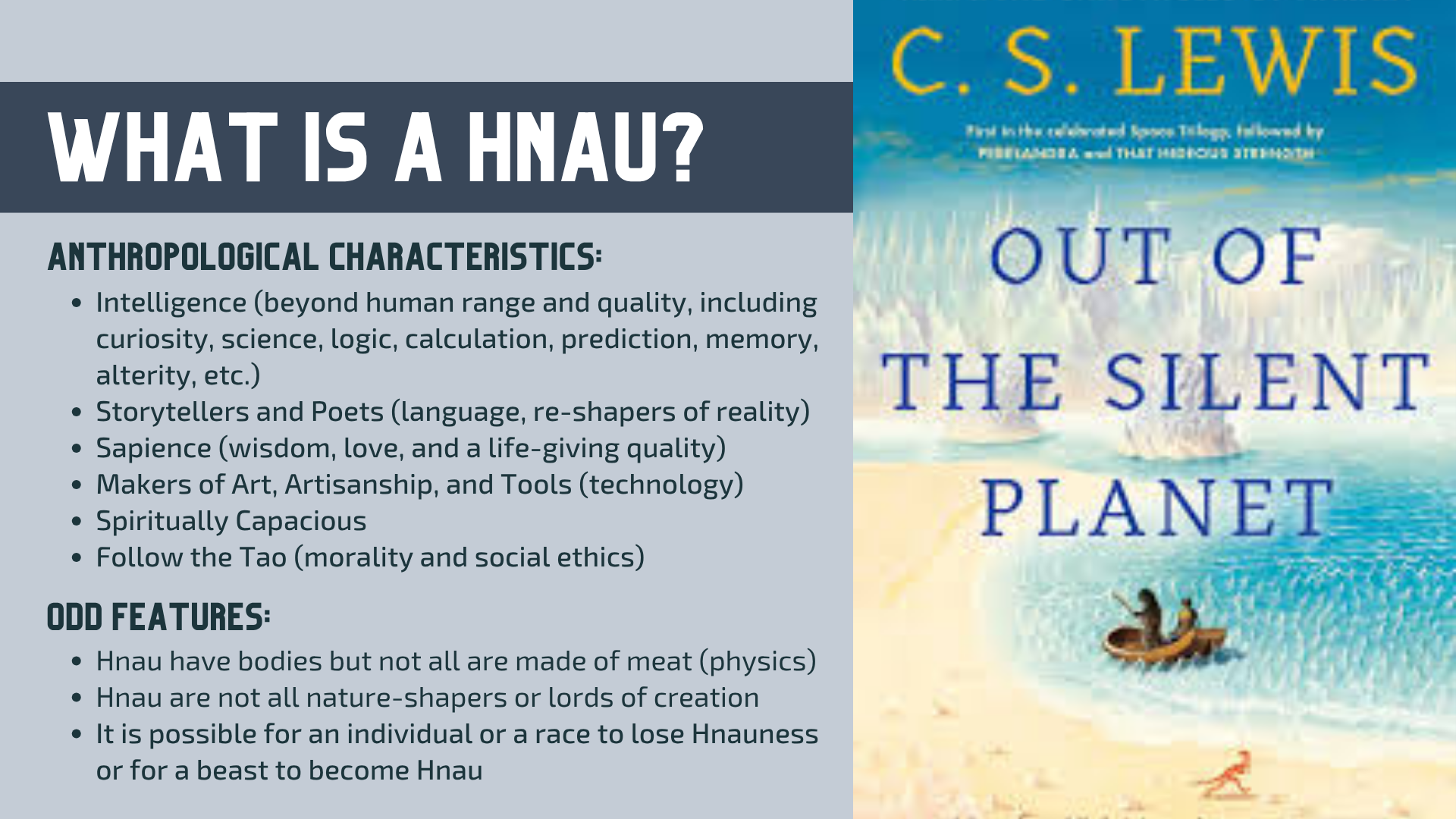 Darko Suvin’s “cognitive estrangement” theory of science fiction argues that SF disturbs readers’ worldview, inviting them to turn a prophetic lens upon their own society. In the 1930s, three wise Malacandrian species cause C.S. Lewis’s hapless protagonist to face the folly of his Eurocentric colonial instincts and renegotiate his understanding of what it means to be human. Lewis coins the term hnau to describe sapient, sentient, spiritually capacious, art- and artisan-making, story-telling, beings of whatever form.