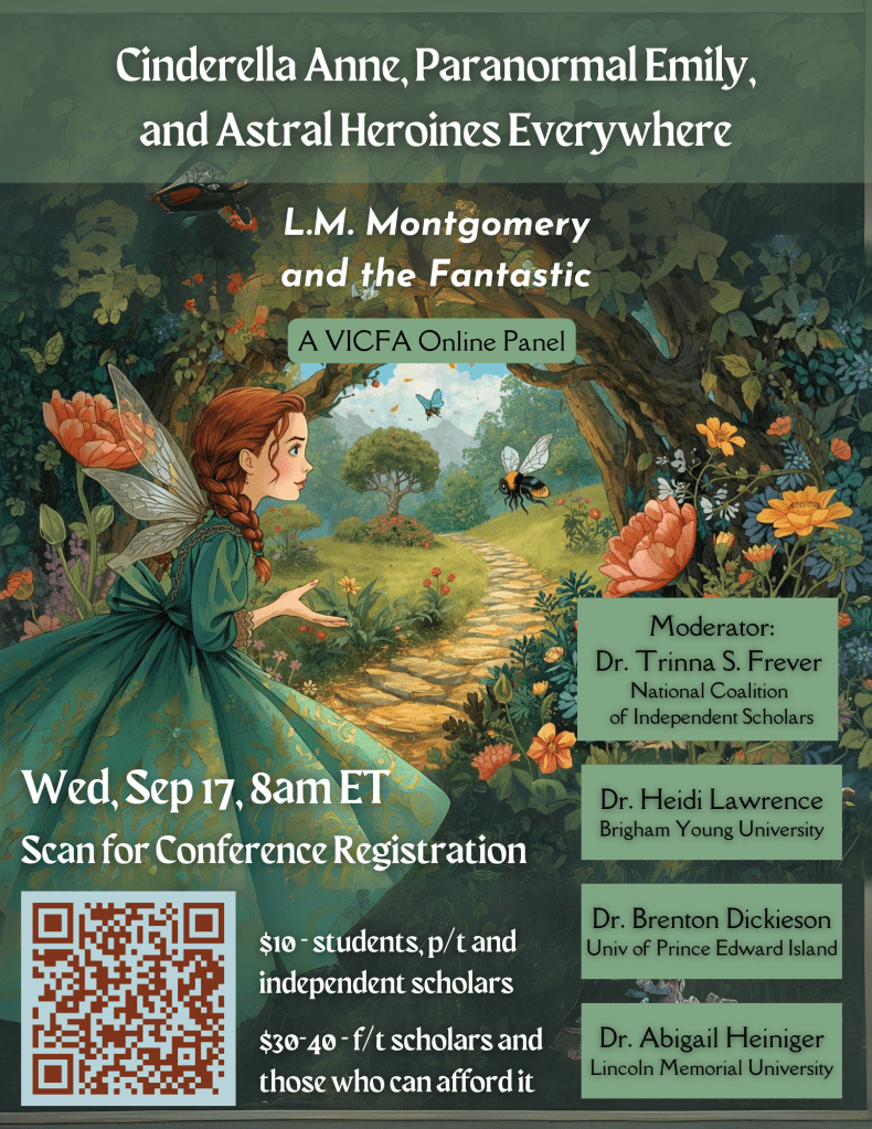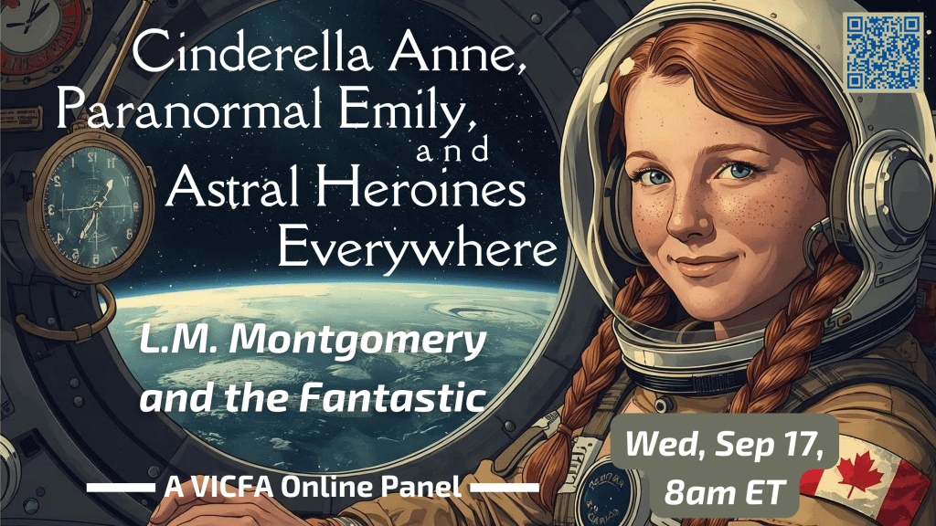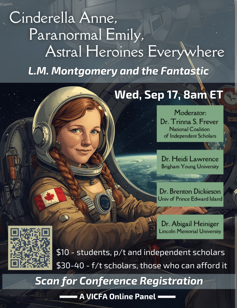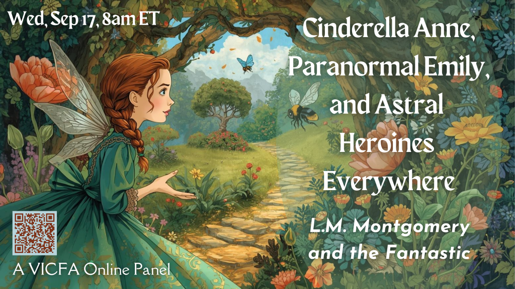 Right now, I am prepping for a conference panel tomorrow that I announced last week: “Cinderella Anne, Paranormal Emily, and Astral Heroines Everywhere: L.M. Montgomery and the Fantastic.” I’m working with with three fantastic scholars (see what I did there?): Heidi Lawrence and Trinna Frever (past MaudCast guests–watch for Heidi in season 3), and Abigail Heiniger (whom I’m meeting for the first time). You can see more about that below, including how to register for the VICFA online conference.