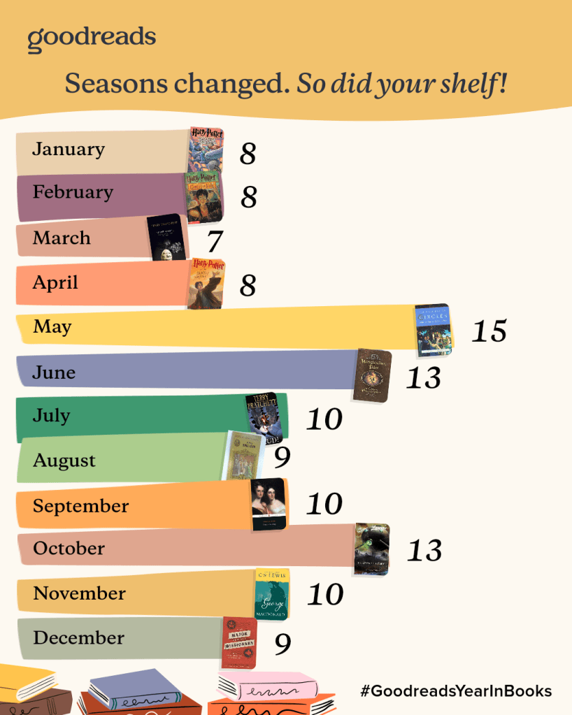 Happy New Year, everyone! As we tumble ahead into this season, I wanted to share the Goodreads “My Year in Books” infographic. I still track my reading in an Excel sheet, but I am no longer fascinated by a month-by-month self-reflection about my reading year. Here, I’ve scooped some images from Goodreads and will add a few reflections to follow. You can see the interactive online infographic here, where you can click on each book and see my ratings or reviews. I hope you have a beautiful year of reading!