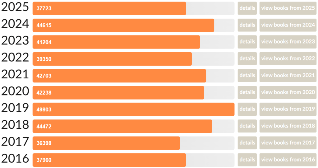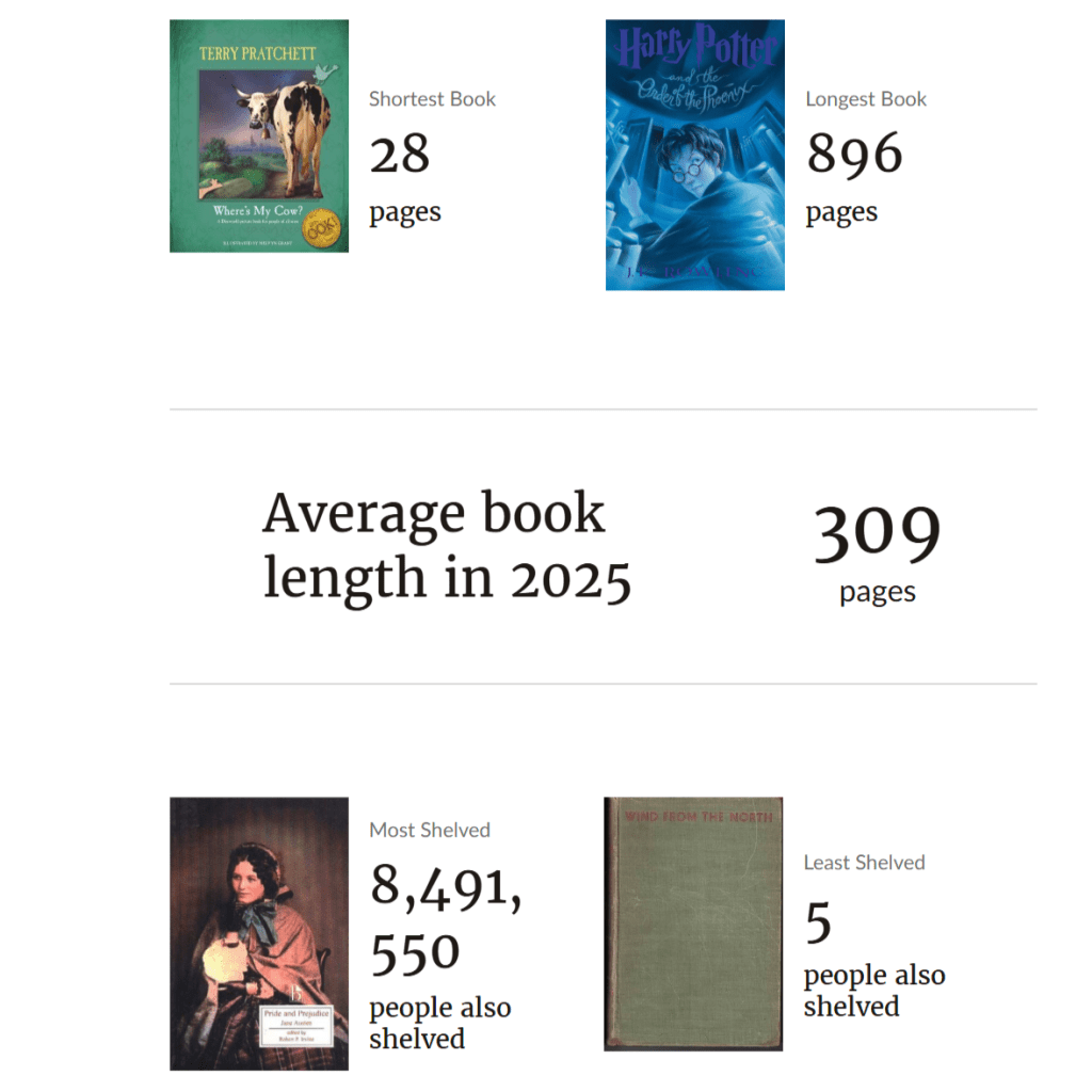 Unfortunately, no one is sending me to the Mariana Trench to check this fact. Still, my decade of tracking reading shows some consistencies between my yearly book count (on the left) and page count (on the right). 2019 was the year of my PhD viva voce, so lots of reading. In 2023, I was ill and burnt out, and I used reading as a balm. When I could no longer read screens in the fall of 2023, I soaked in paperbacks, which tumbled into 2024. 2025 was closer to what I would call “normal,” except that I read fewer books by audio (which isn’t shown here).