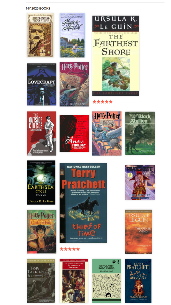 Jeepers, as I look at 2025, it is mostly fantasy fiction–about half of which are rereads. There are a few other features, though.