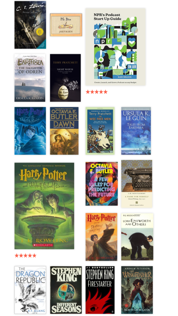 What I would love, though, is a seasonal or even monthly reading review. I began 2026 partway into Ursula K. Le Guin‘s Earthsea chronicles (for a brilliant BA Honours thesis) and Harry Potter. I was also well into rereading Terry Pratchett as the year began. I started 2025 with the full-colour edition of The Last Hero (#27) and finished in December with Snuff (#39)–the antepenultimate Discworld novel. I have just begun Raising Steam (#40), so I’ll finish this Winter. Last year, I finished Andrew Peterson’s brilliant Wingfeather Tales, Stephen King‘s Bachman books and most of the Castle Rock stories, Asimov’s original Foundations trilogy (didn’t love it), John Wyndham’s four major novels (I love Midwich Cuckoos best), Jane Austen‘s major works (still reading through her manuscripts, slowly), and Wodehouse’s humorous Blandings Castle tales. I continued working through R.F. Kuang–whom I admire but struggle with–and returned to some Octavia Butler material.