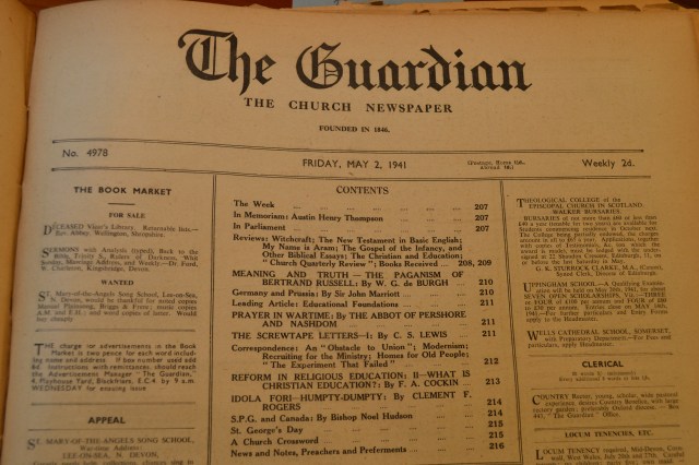 When he had finished the letters (as far as I can tell), he submitted them as a package to The Guardian, an Anglican paper where Lewis published other WWII-era essays. On Apr 25, 1941, the editor of The Guardian announced an upcoming series called The Screwtape Letters by C.S. Lewis.